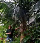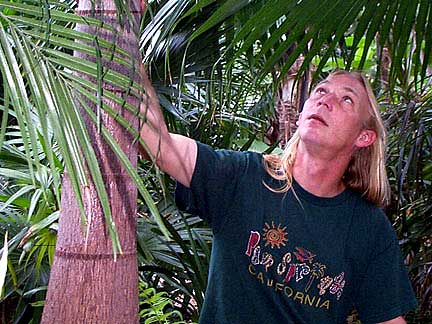 ![]() Wodyetia bifurcata (Foxtail Palm). We have two Foxtail Palms growing in our garden. This is the larger of the two and was planted in the summer of 1997 from a small palm, purchased from, The Palm Society of South Texas "Palm Sale". Our second was a kind gift from Kyle Robinson of Houston TX and It is growing next to our Royal Palm. Will Crump, a Houston gardener, checks out this handsome trunk. Image taken on April 20, 2001